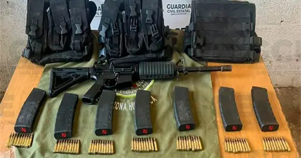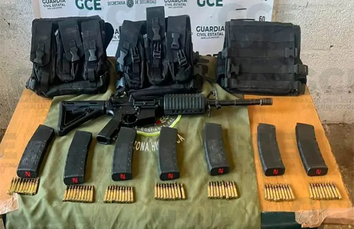 Al notar la presencia de las unidades policiales, los individuos se dieron a la fuga internándose en una zona despoblada, dejando abandonado un arma de fuego tipo fusil de asalto calibre 5.56, además de siete cargadores, 70 cartuchos útiles y tres chalecos tácticos, lo que encendió las alertas por la peligrosidad del equipo localizado.