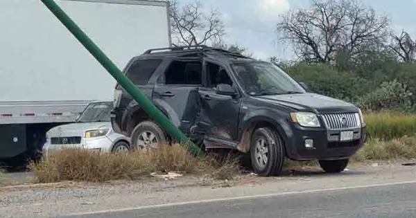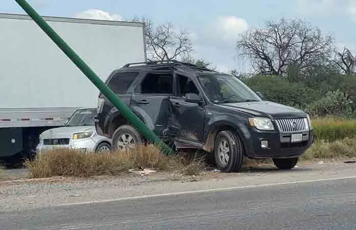 Fue la tarde de este sábado, que la camioneta color negro circulaba por la carretera a Rioverde y la altura de la colonia Real del Potosí, el conductor perdió el control del volante y de esta forma la unidad chocó su costado derecho contra un poste metálico de alumbrado público que ahí se localiza, quedando con fuertes daños materiales.