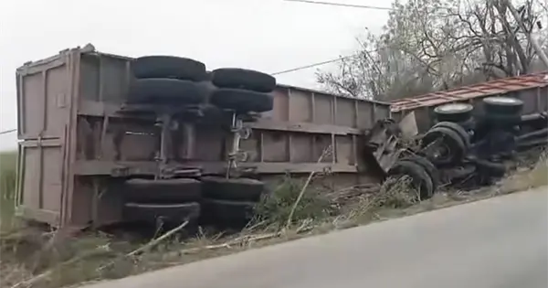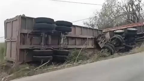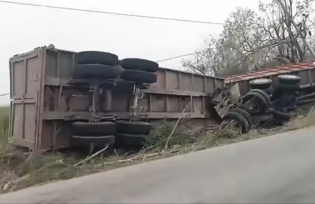 CIUDAD VALLES.- Un camión con doble remolque cargado de caña se salió del camino y volcó en la carretera estatal Valles-Naranjo.