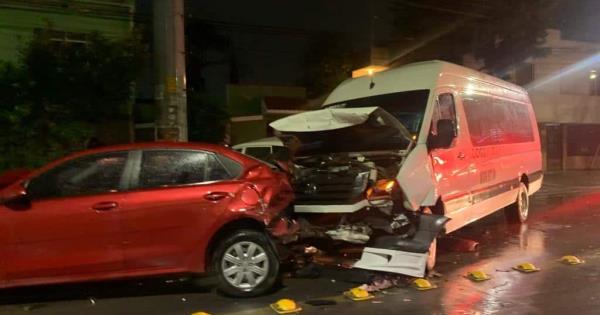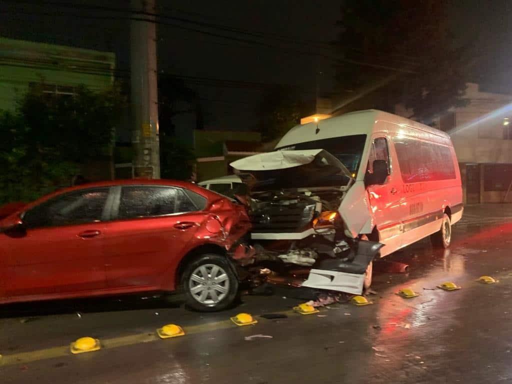 El conductor de una camioneta VW Crafter de color blanco de transporte de personal de la empresa Logimerk, que circulaba sobre avenida San Pedro con dirección al oriente, perdió el control al llegar a la calle del Bosque y chocó con dos vehículos estacionados. El primero fue un automóvil Kia de color rojo, proyectándolo contra una camioneta Toyota Avanza de color blanco, la cual a su vez chocó contra un poste metálico de la CFE.