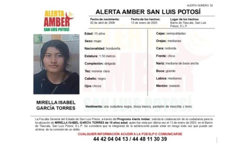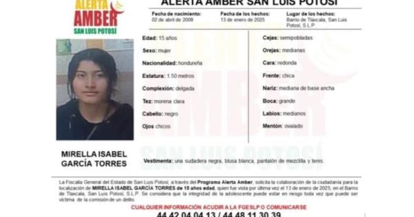 La Fiscalía General del Estado (FGE) activó una Alerta Amber para ubicar a Mirella Isabel García Torres, una adolescente de 15 años de edad.