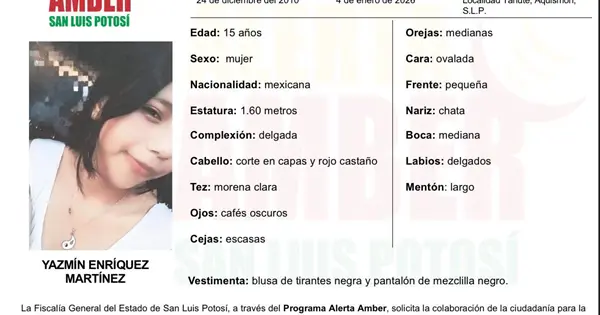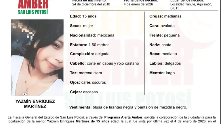 La Fiscalía General del Estado de San Luis Potosí activó una Alerta Amber para la localización de Yazmín Enríquez Martínez, de 15 años de edad, quien fue vista por última vez el 4 de enero de 2026 en la comunidad Tanute, municipio de Aquismón.