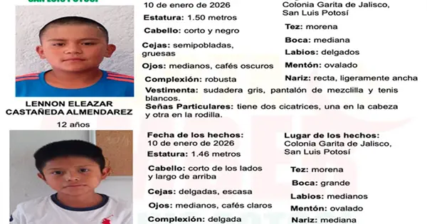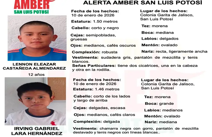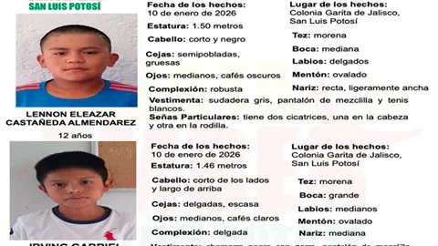 La Fiscalía General del Estado de San Luis Potosí (FGESLP), a través del Programa Alerta Ámber, activó una ficha para la pronta localización de Lennon Eleazar Castañeda Almendárez, de 12 años de edad, e Irving Gabriel Lara Hernández, de 10 años, quienes fueron vistos por última vez el 10 de enero de 2026, en la colonia Garita de Jalisco, en la capital potosina.