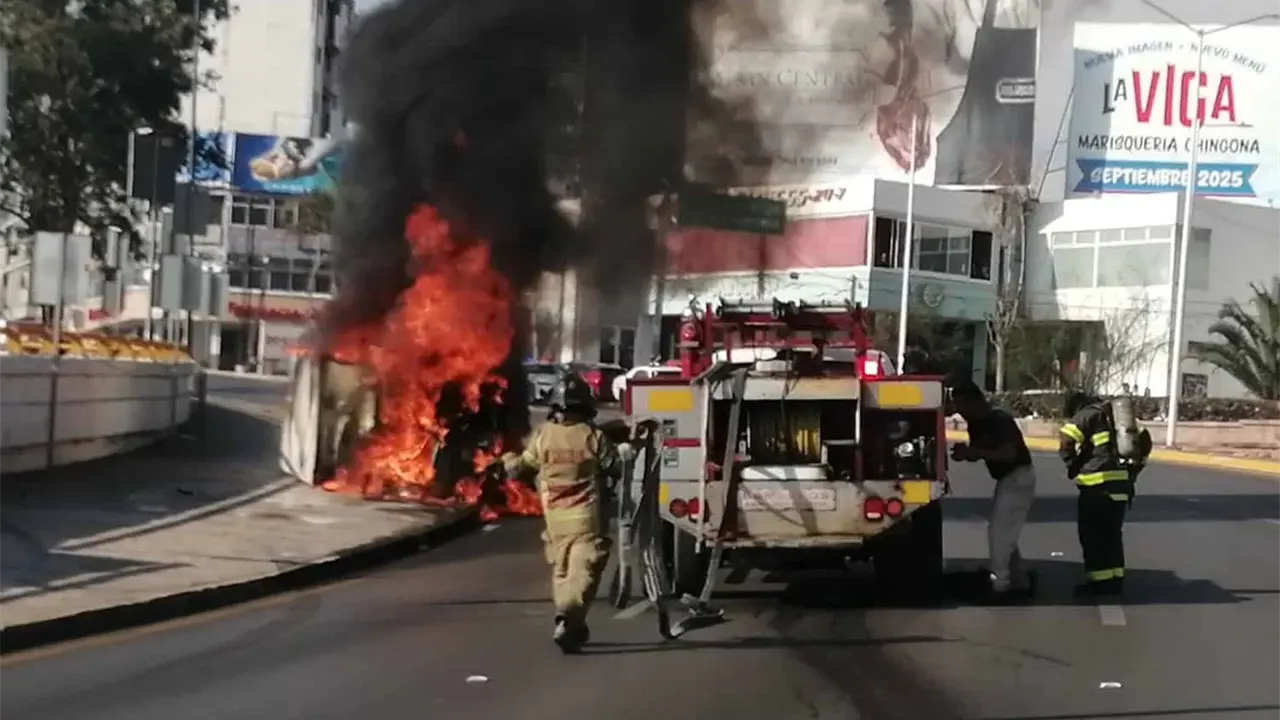 La Policía Vial informó que aplicó el cierre de carriles centrales en Salvador Nava Martínez, justo a la altura del asta Bandera Monumental por el accidente vial que causó el incendio del vehículo. El siniestro se presentó en dirección al poniente (Lomas).