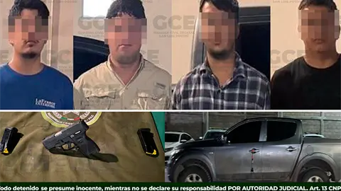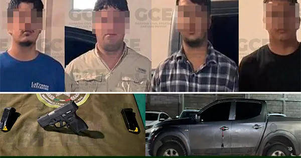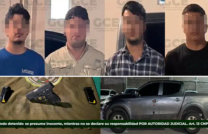 Durante las labores de inteligencia desarrolladas en el Barrio de San Antonio en el municipio de San Ciro de Acosta, agentes de la GCE detuvieron a José "N", Enrique "N" y Luis „N", los tres de 21 años y a Miguel „N" de 18 años, luego de asegurarles un arma de fuego, dos cargadores y 20 cartuchos útiles, lo que derivó a su puesta a disposición ante la Fiscalía General de la República.