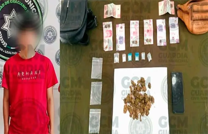 Después de dialogar con él sujeto este se identificó como Ángel “N” de 19 años de edad, quien mostró una actitud agresiva hacia la autoridad, localizándole una bolsa con hierba seca similar a la marihuana, así como 4 dosis de un material blanco granulado similar a la droga sintética conocida como “cristal”, y 500 pesos en efectivo.