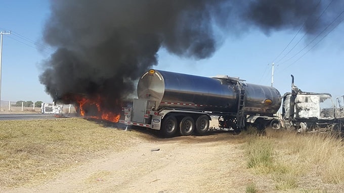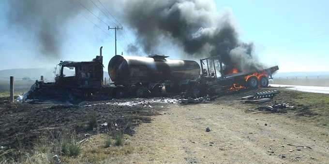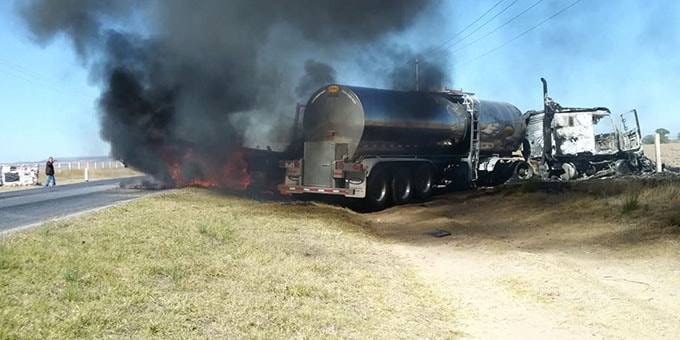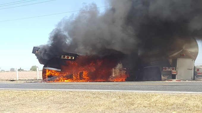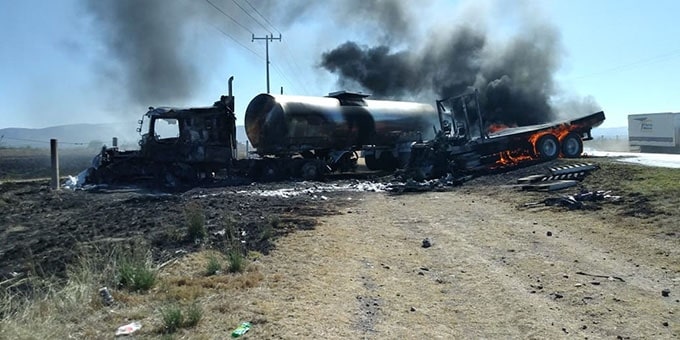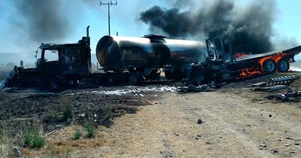 Un choque de dos vehículos de carga pesada y posterior incendio, ocurrido en la carretera a Guadalajara, dejó un saldo de dos personas lesionadas y cuantiosos daños materiales; impactaron un camión torthon tipo plataforma y un tráiler tipo cisterna, los heridos fueron auxiliados por paramédicos de Ojuelos y trasladados al mismo lugar para su atención médica.