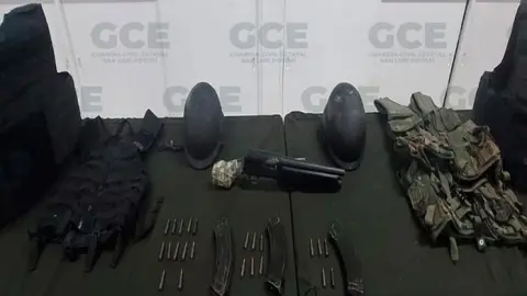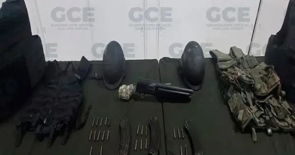 Mediante la Base de Operaciones Mixta Interinstitucional (BOMI), desplegada en el municipio de Villa de Arriaga, se reportó el aseguramiento de una escopeta, tres cargadores para arma larga, 23 cartuchos útiles, tres chalecos tácticos, dos chalecos y dos cascos balísticos.