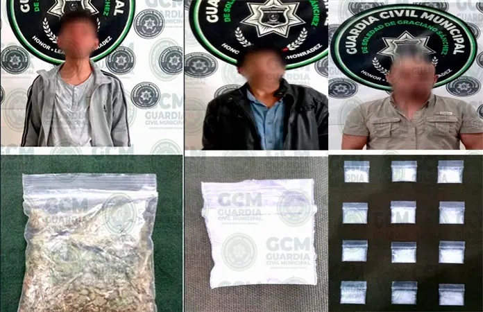 Las detenciones restantes se realizaron en patrullajes preventivos, donde los arrestados fueron detectados inicialmente cometiendo faltas administrativas, concluyendo de la siguiente forma: José "N" de 35 años fue observado en la carretera a Matehuala, a la altura de la comunidad Cándido Navarro, localizándole 12 envoltorios de "cristal".