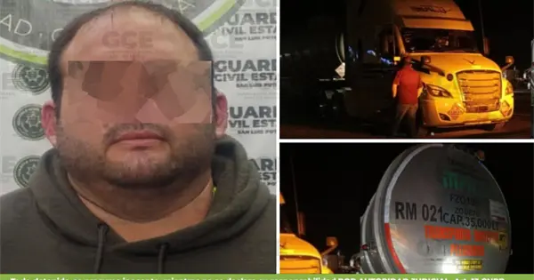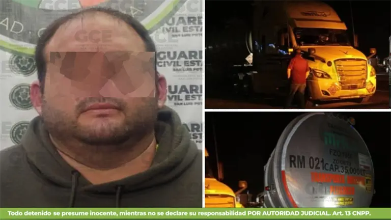 En la comunidad de Peotillos, la División Caminos detuvo a José "N", de 34 años, quien transportaba 75 mil litros de hidrocarburo en un tractocamión con doble semirremolque sobre la carretera 57, con dirección a Matehuala. Según el informe, no pudo acreditar la procedencia legal del combustible.