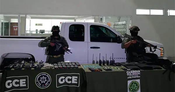 Por ello procedieron a revisarla y en su interior encontraron cuatro armas de fuego largas, tres armas cortas, más de 400 cartuchos útiles, 22 cargadores, 20 dosis de droga, así como equipo táctico y dispositivos de comunicación.