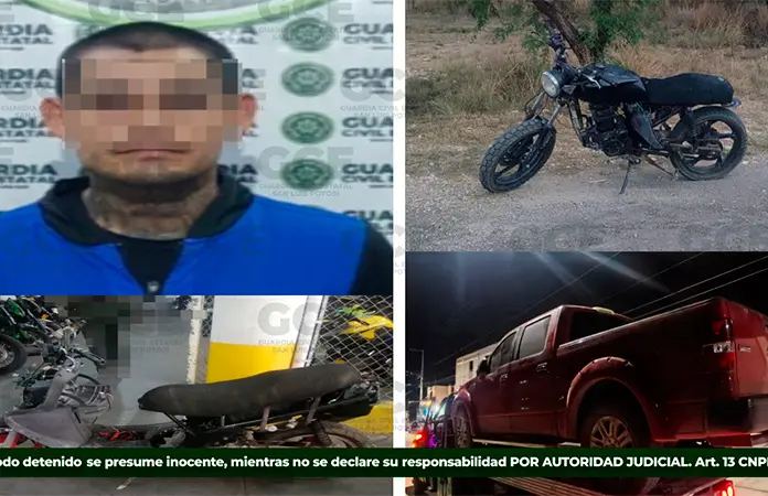 En un primer hecho, en la capital potosina, la GCE aseguró a Jorge "N" de 25 años de edad, el cual fue detectado a bordo de una motocicleta marca Itálika modelo 2011, la cual resultó que contaba con reporte de robo.