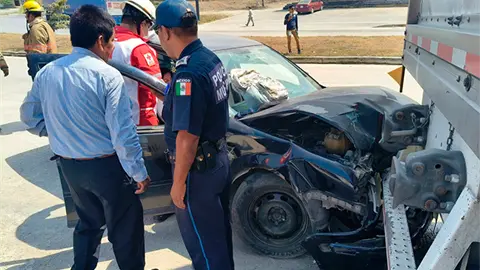 CIUDAD VALLES.- Un automóvil chocó contra el remolque de un tráiler estacionado en la avenida Universidad, frente a la agencia cervecera Corona.
