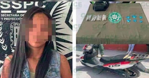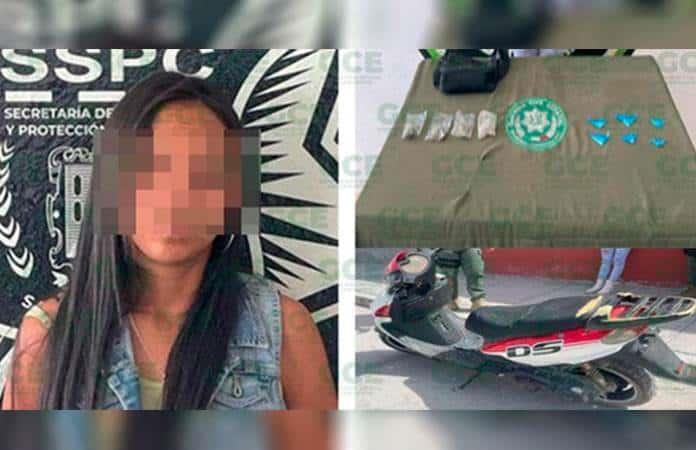 A la mujer, América “N” de 25 años de edad, se le aseguraron cuatro bolsas con marihuana y seis dosis de “cristal”, además de la motocicleta Italika color blanco en la que se desplazaba.