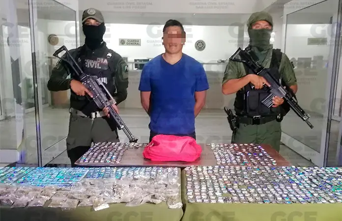 AXTLA DE TERRAZAS.- Con miles de dosis de droga, tanto de cristal como de marihuana, un presunto narcomenudista fue capturado en el municipio huasteco de Axtla de Terrazas, elementos de la Guardia Civil Estatal pudieron detectarlo mediante operativos de seguridad e inteligencia realizados en la zona.