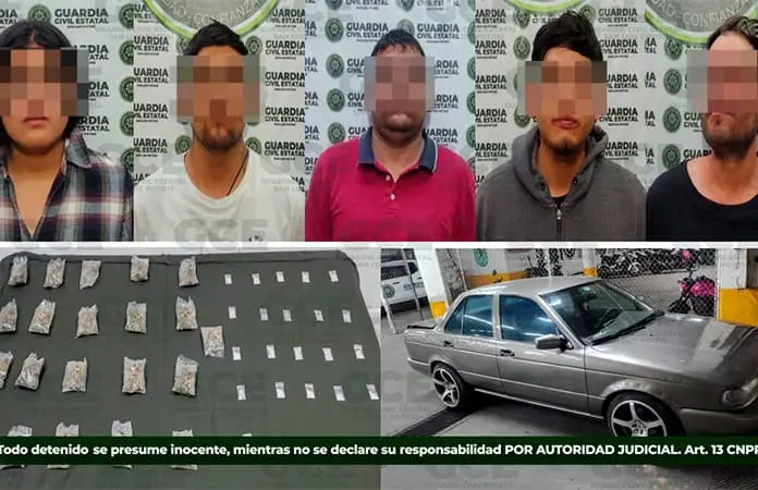 Por el delito de daños, cuatro hombres y una mujer fueron detenidos por elementos de la Guardia Civil Estatal en la capital potosina luego de que causaran una serie de daños en un domicilio de la colonia Garita de Jalisco, además les decomisaron una importante cantidad de marihuana y cristal.