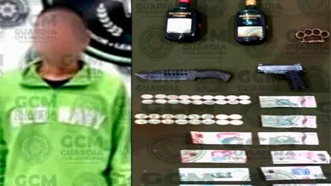 Por tal motivo, se les realizó una inspección preventiva localizándoles una pistola de uso deportivo, una navaja y un bóxer, así como mil 300 pesos en efectivo —monto que coincidía con lo descrito en el reporte— y dos botellas de bebidas alcohólicas.