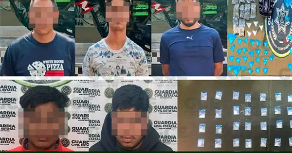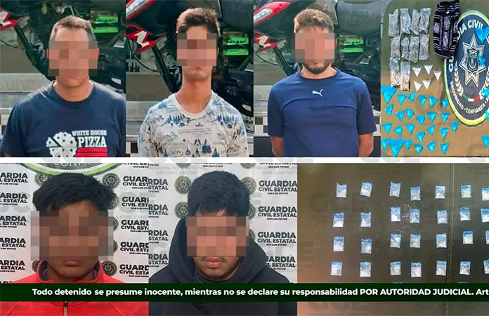 El primer hecho tuvo lugar en el municipio de Ciudad Valles, donde efectivos de la GCE detuvieron a Juan "N" de 21 años, Leonardo "N" de 26 años y a Jashiel "N" de 27 años, luego de asegurarles 48 dosis de "cristal", 10 bolsas con marihuana, cinco de cocaína, 14 objetos "ponchallantas" y una motocicleta en la que se desplazaban.