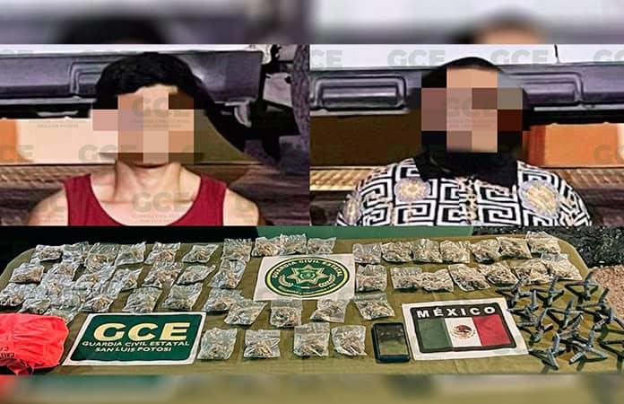 A los presuntos, Miguel “N” de 21 años y Jesús “N” de 26 años, se les aseguraron 48 bolsas de marihuana 12 artefactos metálicos en forma de estrella denominados “poncha llantas” y un vehículo Ford Escape color blanco modelo 2012 sin placas.