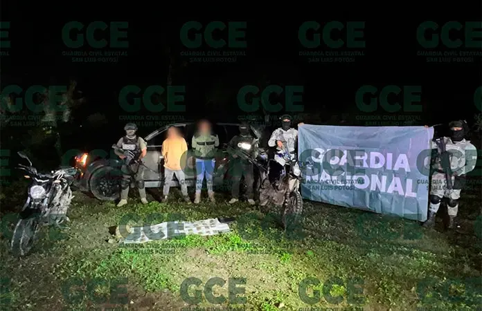 La corporación informó que durante la implementación del dispositivo Base de Operaciones Mixtas Interinstitucional (BOMI), en el municipio referido, se logró la detención de Juan "N" y Diego "N", originarios del estado de Jalisco, a quienes se les aseguraron 40 bolsas con marihuana y dos motocicletas.