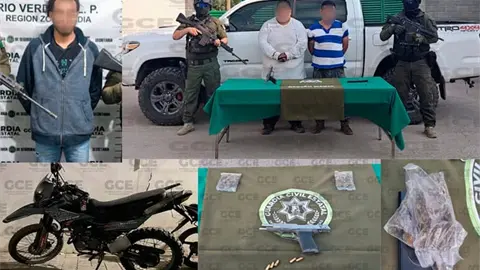 RIOVERDE.- Dos sujetos armados y que traían bolsas con marihuana, fueron capturados por elementos de la Guardia Civil Estatal en el municipio de Rioverde, mientras que otro más fue detectado en la comunidad de Cañada Grande, esto en operativos de seguridad en la zona media del estado.
