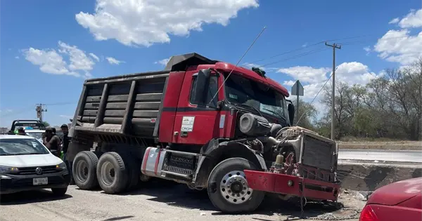 El accidente se registró después de las 12:00 de este mediodía, cuando el conductor de un camión materialista cargado se recargó en el acotamiento de carril central de la carretera por tratar de esquivar un vehículo.