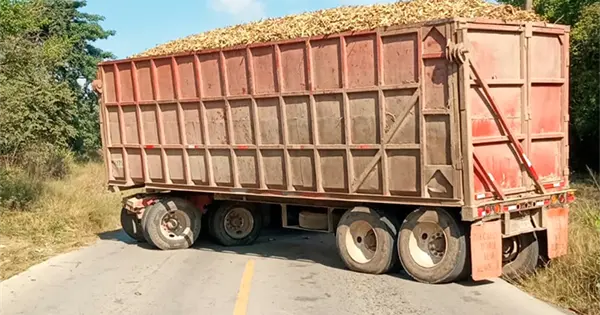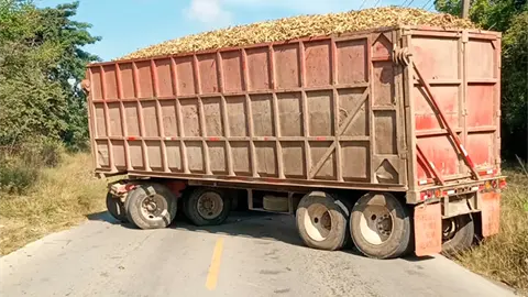 Un tráiler cargado con caña picada quedó varado en una declive que se ubica entre la cascada artificial La Virgencita y la hidroeléctrica de Micos.
