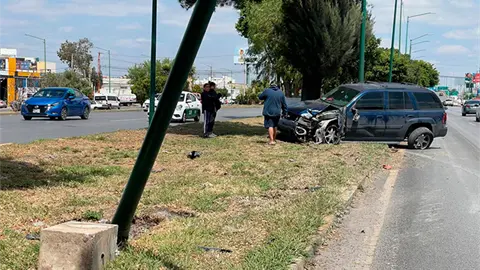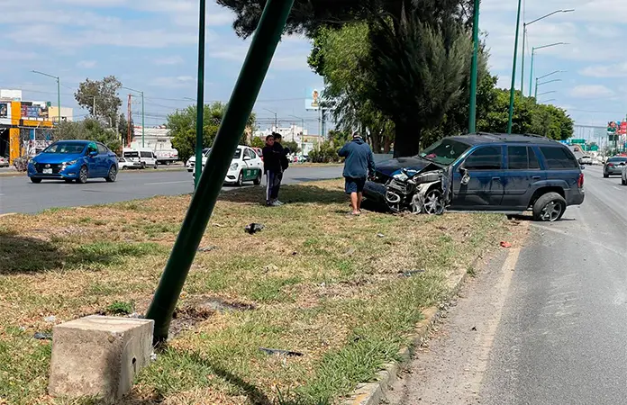 A causa de una falla mecánica, el conductor de una camioneta perdió el control del volante y así la unidad chocó contra un poste de alumbrado público, esto cuando se desplazaba por la carretera a Matehuala.