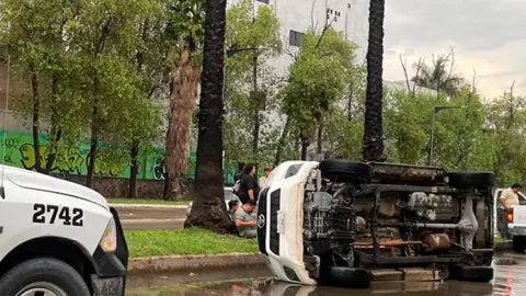 Camioneta se vuelca al circular sobre piso resbaloso por la lluvia