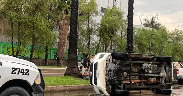 Sólo daños materiales se registraron en la volcadura de una camioneta que en plena lluvia se desplazaba a alta velocidad por el río Santiago, el conductor perdió control del volante al salir de una curva a la altura del puente de la calle Mariano Otero.