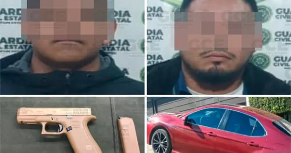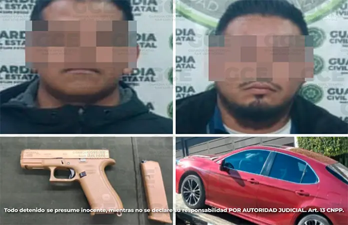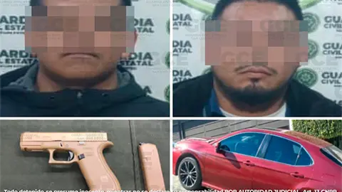 Derivado de esta intervención, se logró la detención de Carlos "N" y Francisco "N", ambos de 29 años, a quienes se les aseguró un arma de fuego tipo pistola, calibre 9 milímetros, con un cargador abastecido con cinco cartuchos útiles y un vehículo marca Toyota, tipo Camry, color rojo.
