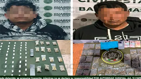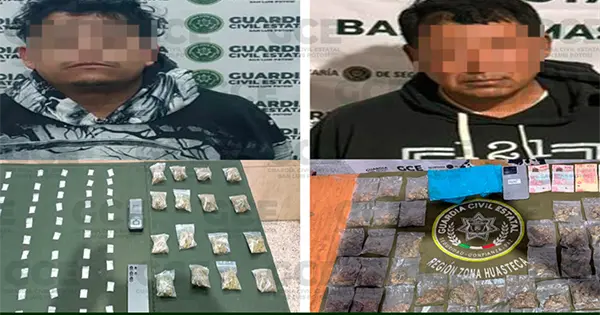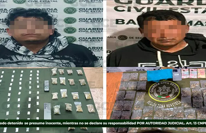 Dos presuntos narcotraficantes, uno en esta capital y otro en la Huasteca Potosina, fueron detenidos por elementos de la Guardia Civil Estatal con diversas dosis de estupefacientes y dinero en efectivo, siendo remitidos a las autoridades correspondientes. Además, uno de ellos también se dedicaba a la extorsión.