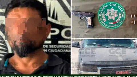 El individuo dijo llamarse Miguel Ángel "N" de 46 años de edad, el cual andaba armado con una pistola calibre .45 milímetros y se determinó la camioneta en que se desplazaba cuenta con reporte de robo.