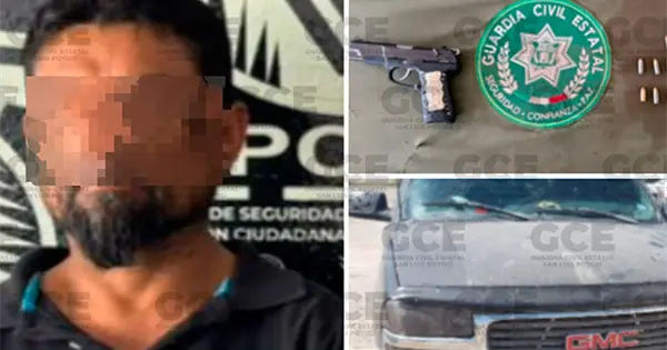 En otro hecho, como parte de los operativos interinstitucionales realizados con la Secretaría de la Defensa Nacional y la Guardia Nacional, autoridades estatales detuvieron a Iván "N", de 44 años de edad, en el municipio de Matehuala, a quien se le aseguró un arma de fuego corta calibre 9 milímetros, un cargador, 10 cartuchos útiles.
