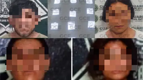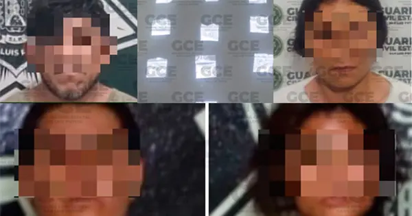Asimismo, en la Zona Altiplano, en el municipio de Matehuala, la GCE detuvo a José "N", de 25 años de edad, y a Madai "N" de 27 años, tras asegurarles trece bolsitas de marihuana y doce artefactos conocidos como "ponchallantas".