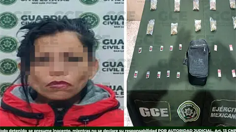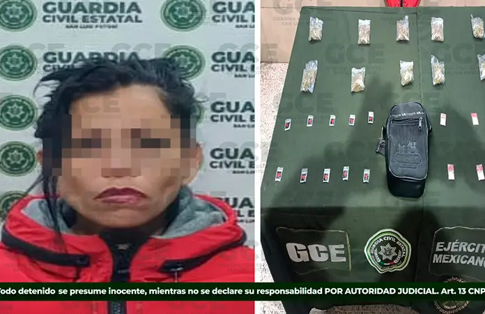 Una mujer, que cuenta con amplio historial delictivo y presunta integrante de un grupo criminal, fue capturada con diversas dosis de droga por agentes de la Guardia Civil Estatal, que la sorprendieron mientras realizaban patrullajes en la colonia Los Reyitos, en esta capital potosina.