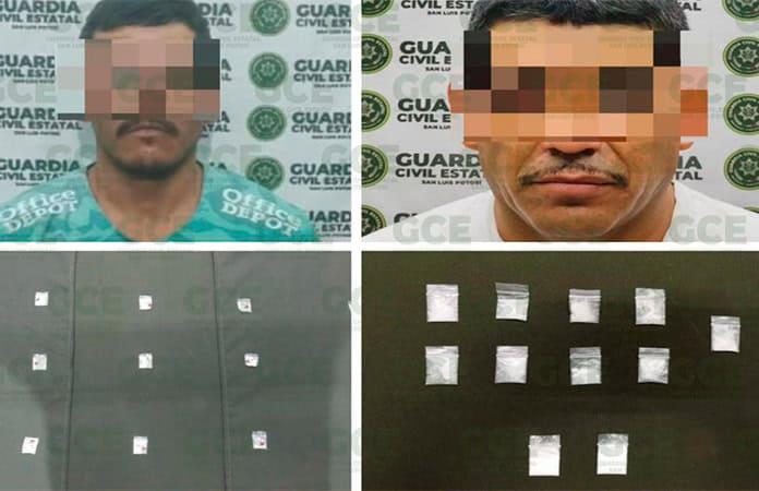 En distintos hechos, elementos de la GCE detuvieron a dos presuntos narcomenudistas, a quienes se les aseguraron en total 26 dosis de droga y un vehículo.