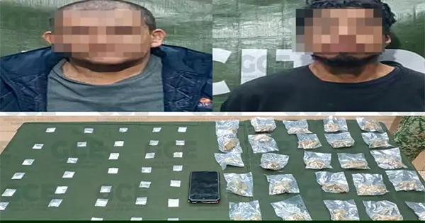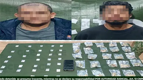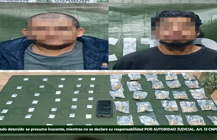 Los individuos dijeron llamarse José Carlos "N" de 31 años de edad y Pedro "N" de 50 años, a quienes en la inspección les aseguraron un total de 33 dosis de "cristal" y 25 de marihuana que traían para su supuesta venta en la zona.