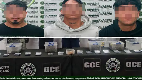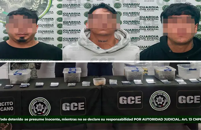 La Guardia Civil Estatal informa que, como resultado de los operativos permanentes de seguridad y vigilancia implementados para la prevención del delito y el combate frontal al narcomenudeo, se logró la detención de tres personas del sexo masculino en la colonia Misión del Palmar, perteneciente a Villa de Pozos, San Luis Potosí.