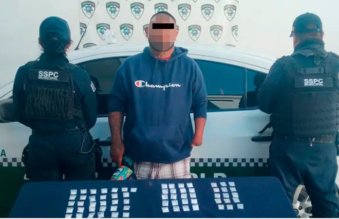 Ante el probable hecho constitutivo de delitos contra la salud, se procedió con la detención de Julián Eduardo "N" de 32 años, quien fue llevado al área de Justicia Cívica para su certificación médica y posteriormente fue presentado a la Fiscalía General del Estado donde se determinará su situación legal.