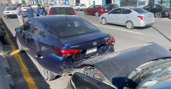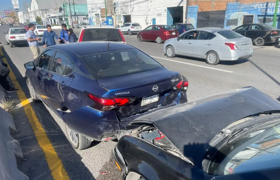 De acuerdo con el reporte, una camioneta roja que circulaba con dirección al distribuidor Juárez fue impactada por alcance al llegar a la calle Samaripa por una camioneta Honda blanca. Tras ese primer golpe, se generó una carambola en la que también participaron un Nissan Versa azul, un Volkswagen Jetta azul y un Chevrolet Spark blanco.