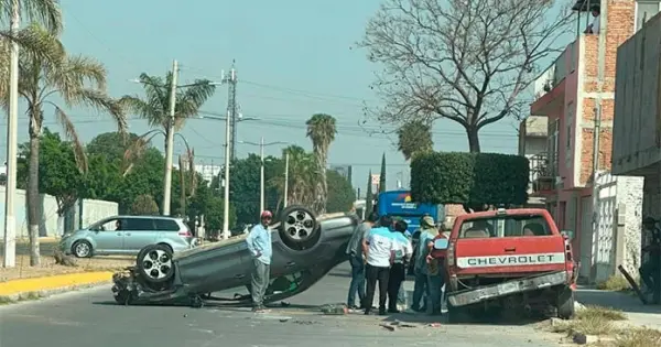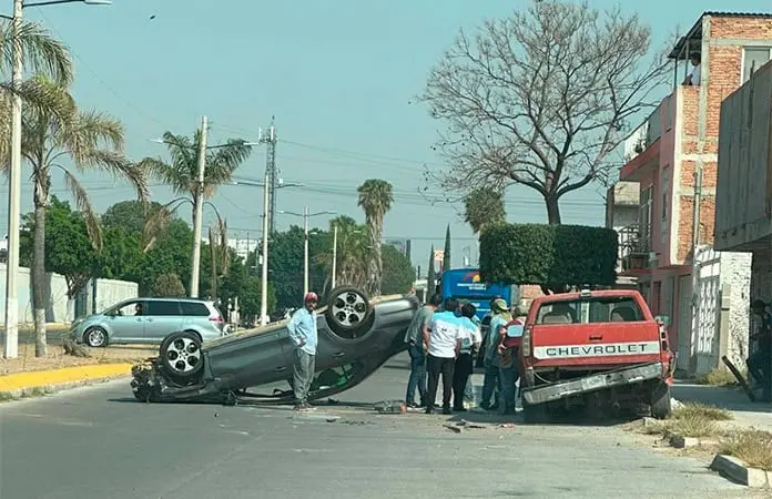 Fuertes daños materiales, aunque aparentemente sin personas lesionadas de gravedad, fue el saldo de un aparatoso accidente ocurrido en el fraccionamiento Esmeralda, por el rumbo de la colonia Valle Dorado, en donde impactaron un automóvil y una camioneta y el primero acabó volcado sobre su toldo.