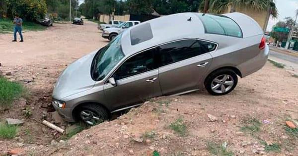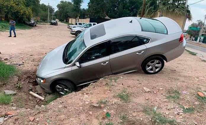 Un automóvil que circulaba por la avenida Soledad, en la colonia San Felipe, acabó en una zanja abandonada, con los consecuentes daños que presentó, aunque por fortuna hoy no lesionados en este caso.