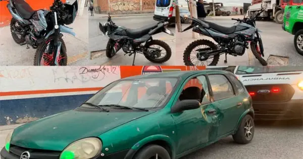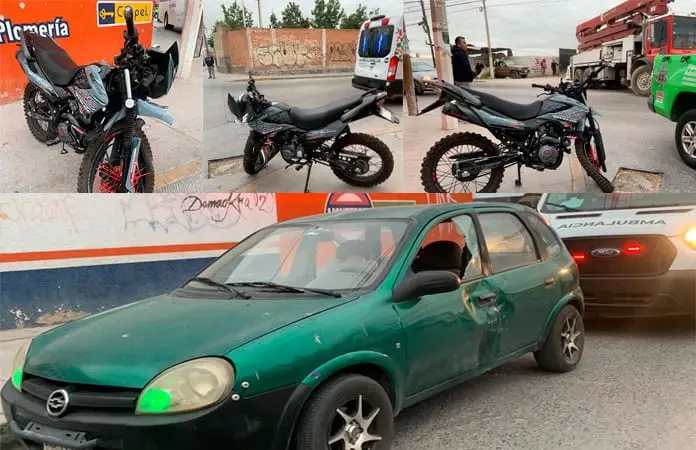 Un motociclista resultó solo con golpes leves al chocar contra un automóvil que se le atravesó en la colonia Valle de San Isidro, en el municipio de Soledad de Graciano Sánchez.
