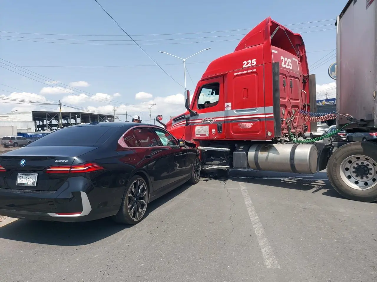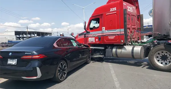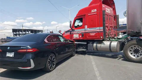 El incidente fue reportado después de las 12:00 horas, cuando un tráiler realizaba maniobras para ingresar a las bodegas de la empresa Corona. De acuerdo con la información disponible, al incorporarse, la pesada unidad habría cortado la circulación a un automóvil BMW que transitaba con dirección a la carretera a Matehuala.