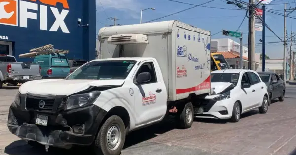 Únicamente daños materiales, fue el saldo de un choque por alcance de tres vehículos en avenida Universidad y calle Octava con dirección a la Alameda, en la zona centro.