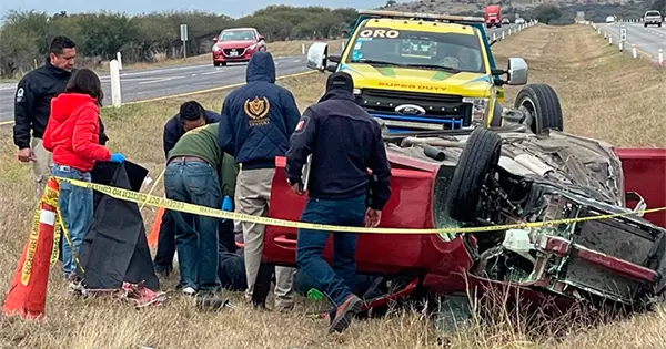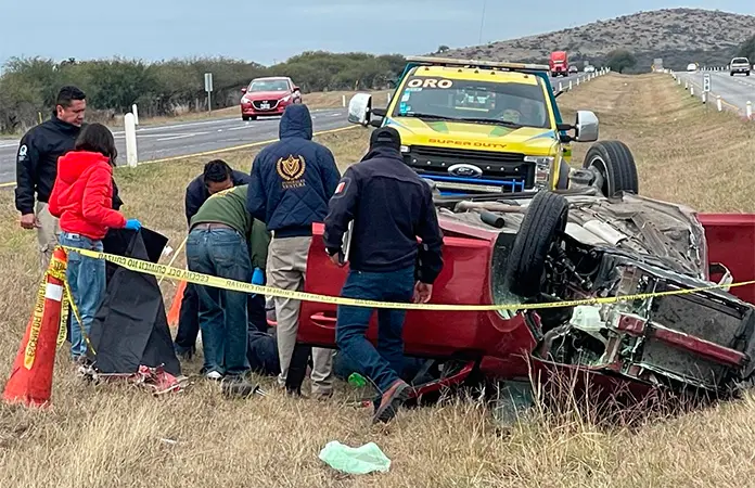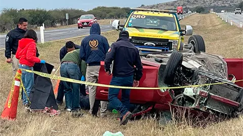 Un muerto y dos lesionados en choque y volcadura en la carretera a Matehuala, en donde un automóvil chocó por alcance contra un tráiler quedando finalmente volcado fuera de la carpeta asfáltica.