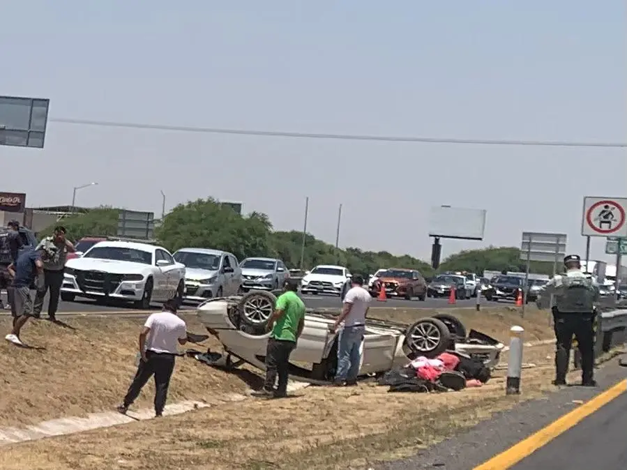 San Luis Potosí.– Un vehículo terminó volcado en la cuneta central de la carretera 57, luego de ser impactado por un tráiler este sábado, poco después del mediodía.