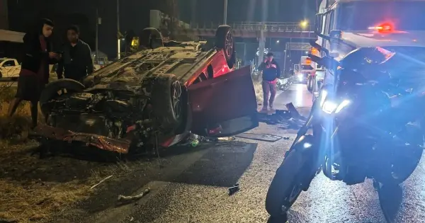 Daños materiales de consideración se registraron en un choque con volcadura entre un tráiler y un automóvil particular en carriles centrales de carretera '57, en el tramo del Río Españita y Periférico Oriente.