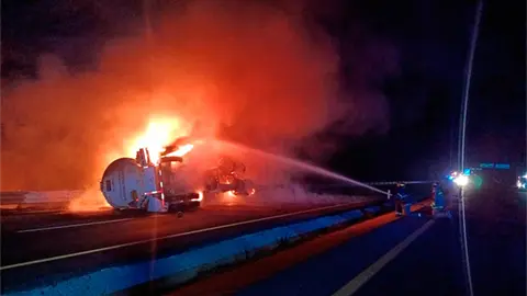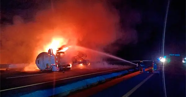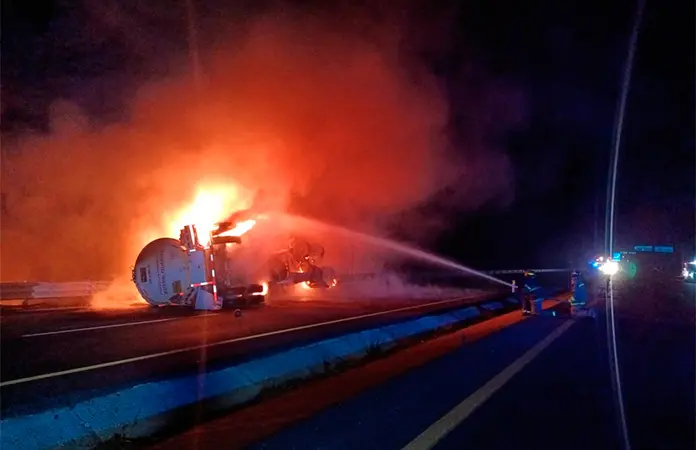 Tras el desprendimiento, la cisterna salió de la carpeta asfáltica, volcó y, derivado de la fricción, se originó un incendio que consumió el remolque en su totalidad.